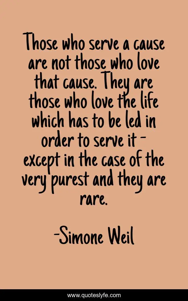 This page presents the quote "Those who serve a cause are not those who love that cause. They are those who love the life which has to be led in order to serve it - except in the case of the very purest and they are rare.". Author of this quote is Simone Weil. This quote is about belief, conviction,.
