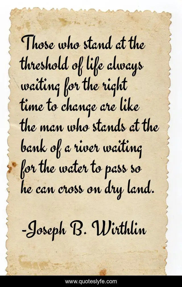 This page presents the quote "Those who stand at the threshold of life always waiting for the right time to change are like the man who stands at the bank of a river waiting for the water to pass so he can cross on dry land.". Author of this quote is Joseph B. Wirthlin. This quote is about water, life, change,.