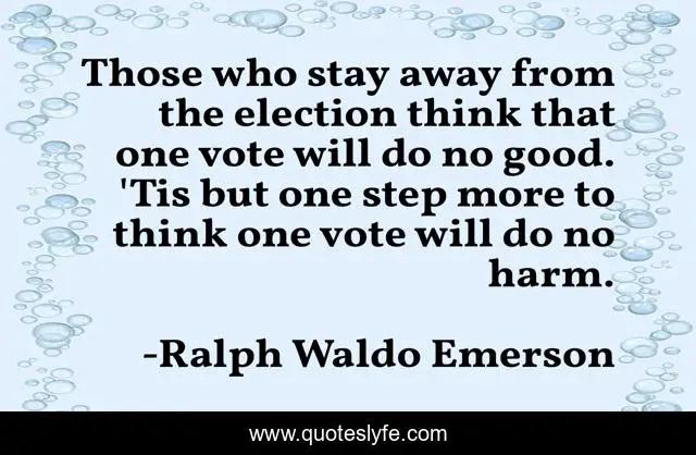 This page presents the quote "Those who stay away from the election think that one vote will do no good. 'Tis but one step more to think one vote will do no harm.". Author of this quote is Ralph Waldo Emerson. This quote is about vote, political,.