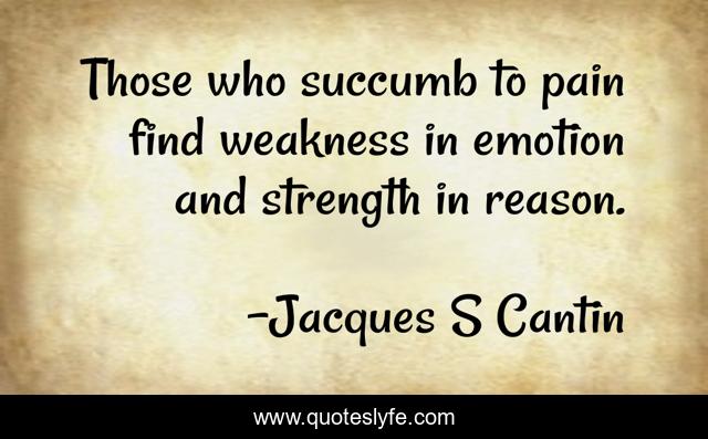 This page presents the quote "Those who succumb to pain find weakness in emotion and strength in reason.". Author of this quote is Jacques S Cantin. This quote is about philosophy-of-mind, philosophy-of-life, philosophy, philosophy-of-people,.