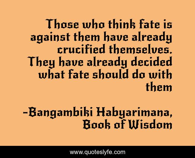 "Bangambiki Habyarimana, Book of Wisdom Quotes." Quoteslyfe.com, 2025. Mon. 08 Dec. 2025. <https://www.quoteslyfe.com/quote/Those-who-think-fate-is-against-them-106894>.