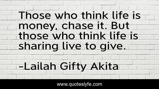 This page presents the quote "Those who think life is money, chase it. But those who think life is sharing live to give.". Author of this quote is Lailah Gifty Akita. This quote is about living, life, giving, money, work, inspirational, life-philosophy, enthusiasm,.
