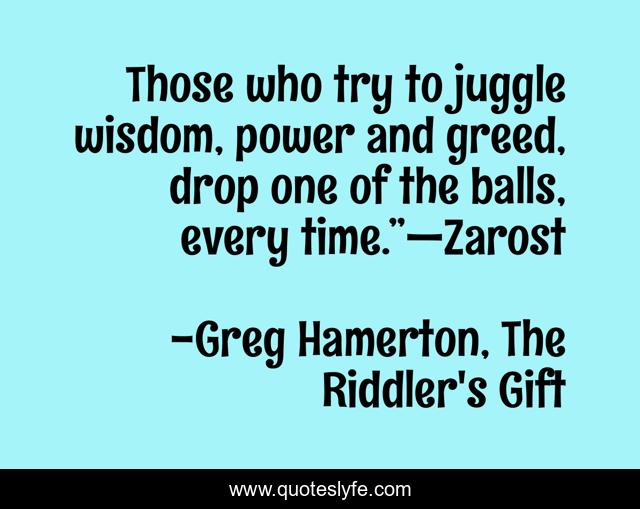 This page presents the quote "Those who try to juggle wisdom, power and greed, drop one of the balls, every time.”—Zarost". Author of this quote is Greg Hamerton, The Riddler's Gift. This quote is about fantasy-fiction, fantasy-books, greed, power, wisdom,.