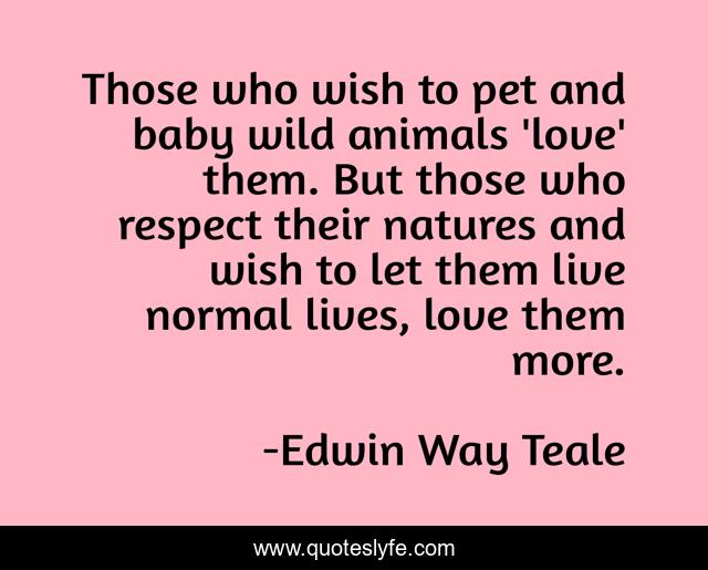 This page presents the quote "Those who wish to pet and baby wild animals 'love' them. But those who respect their natures and wish to let them live normal lives, love them more.". Author of this quote is Edwin Way Teale. This quote is about pet, baby, love, affection,.