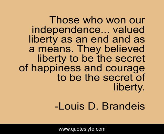 This page presents the quote "Those who won our independence... valued liberty as an end and as a means. They believed liberty to be the secret of happiness and courage to be the secret of liberty.". Author of this quote is Louis D. Brandeis. This quote is about courage, end, liberty,.