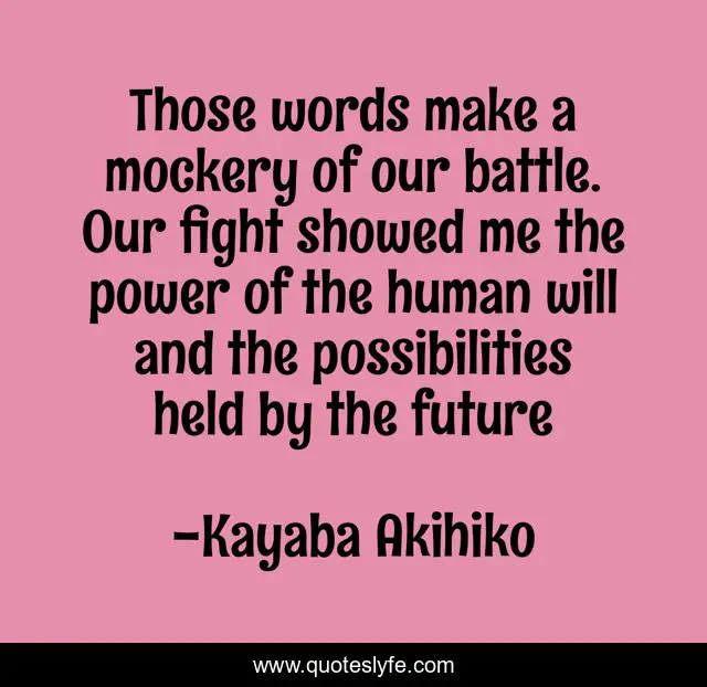 This page presents the quote "Those words make a mockery of our battle. Our fight showed me the power of the human will and the possibilities held by the future". Author of this quote is Kayaba Akihiko. This quote is about enthusiasm, strong, sao, inspirational,.