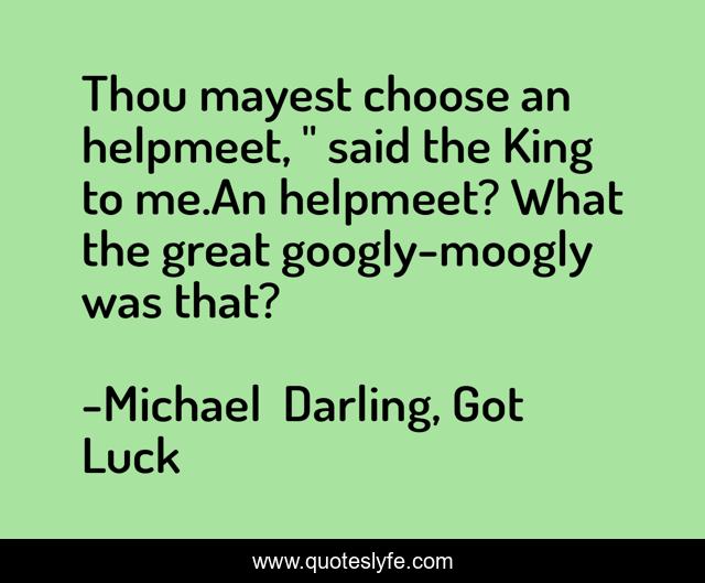 This page presents the quote "Thou mayest choose an helpmeet, " said the King to me.An helpmeet? What the great googly-moogly was that?". Author of this quote is Michael Darling, Got Luck. This quote is about funny, bible, marriage, comedy,.