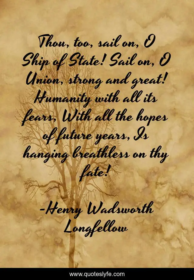 Thou, too, sail on, O Ship of State! Sail on, O Union, strong and great! Humanity with all its fears, With all the hopes of future years, Is hanging breathless on thy fate!