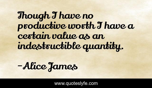 This page presents the quote "Though I have no productive worth I have a certain value as an indestructible quantity.". Author of this quote is Alice James. This quote is about self, knowledge,.