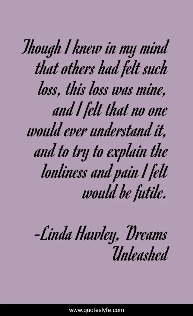 This page presents the quote "Though I knew in my mind that others had felt such loss, this loss was mine, and I felt that no one would ever understand it, and to try to explain the lonliness and pain I felt would be futile.". Author of this quote is Linda Hawley, Dreams Unleashed. This quote is about grief, loss, loneliness,.