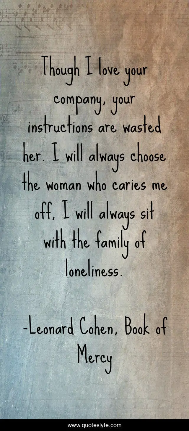 This page presents the quote "Though I love your company, your instructions are wasted her. I will always choose the woman who caries me off, I will always sit with the family of loneliness.". Author of this quote is Leonard Cohen, Book of Mercy. .