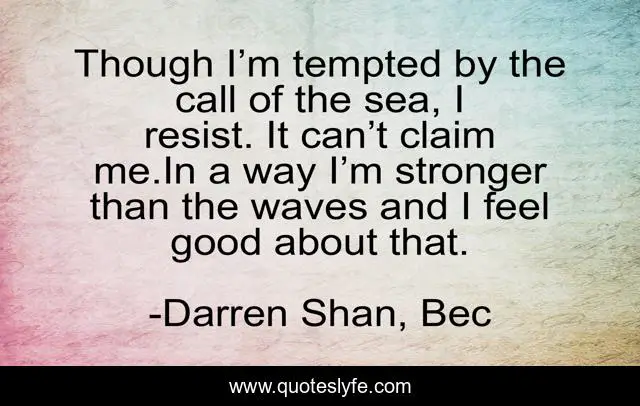 This page presents the quote "Though I’m tempted by the call of the sea, I resist. It can’t claim me.In a way I’m stronger than the waves and I feel good about that.". Author of this quote is Darren Shan, Bec. This quote is about the-ocean, strength, the-sea, strong, waves,.