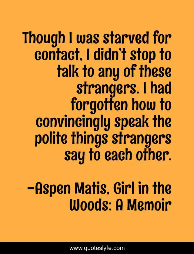 This page presents the quote "Though I was starved for contact, I didn’t stop to talk to any of these strangers. I had forgotten how to convincingly speak the polite things strangers say to each other.". Author of this quote is Aspen Matis, Girl in the Woods: A Memoir. This quote is about hiking, aspen-matis, pct, young-woman, memoir,.