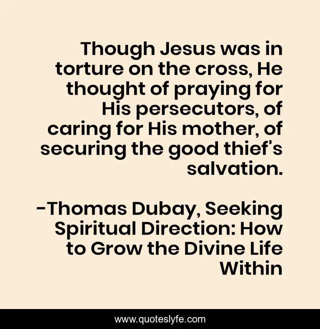 This page presents the quote "Though Jesus was in torture on the cross, He thought of praying for His persecutors, of caring for His mother, of securing the good thief's salvation.". Author of this quote is Thomas Dubay, Seeking Spiritual Direction: How to Grow the Divine Life Within. This quote is about duty, cross, jesus,.