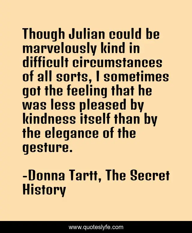 "Donna Tartt, The Secret History Quotes." Quoteslyfe.com, 2025. Sat. 06 Dec. 2025. <https://www.quoteslyfe.com/quote/Though-Julian-could-be-marvelously-kind-in-136331>.