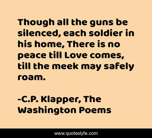 This page presents the quote "Though all the guns be silenced, each soldier in his home, There is no peace till Love comes, till the meek may safely roam.". Author of this quote is C.P. Klapper, The Washington Poems. This quote is about life, peace, love, war, affection,.