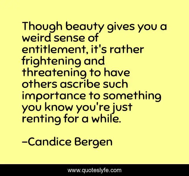 This page presents the quote "Though beauty gives you a weird sense of entitlement, it's rather frightening and threatening to have others ascribe such importance to something you know you're just renting for a while.". Author of this quote is Candice Bergen. .