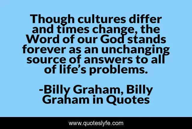 This page presents the quote "Though cultures differ and times change, the Word of our God stands forever as an unchanging source of answers to all of life’s problems.". Author of this quote is Billy Graham, Billy Graham in Quotes. This quote is about life, billy-graham,.