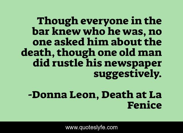 This page presents the quote "Though everyone in the bar knew who he was, no one asked him about the death, though one old man did rustle his newspaper suggestively.". Author of this quote is Donna Leon, Death at La Fenice. This quote is about mystery, funny, comedy,.