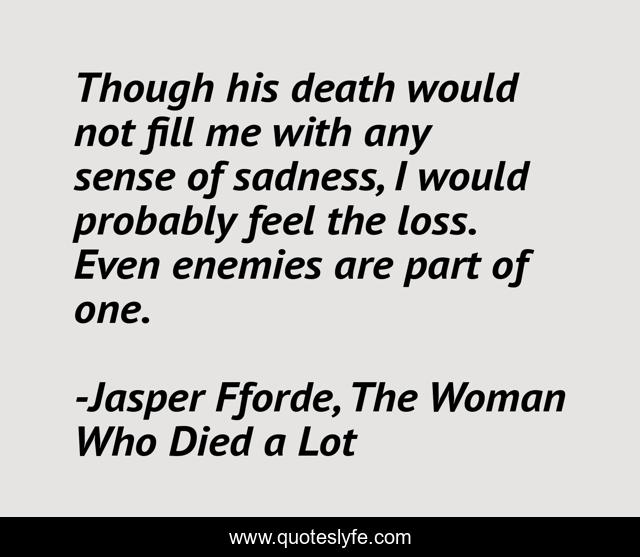 This page presents the quote "Though his death would not fill me with any sense of sadness, I would probably feel the loss. Even enemies are part of one.". Author of this quote is Jasper Fforde, The Woman Who Died a Lot. This quote is about enemy, sadness, death, enemies, loss,.