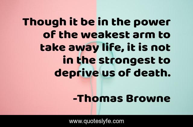 This page presents the quote "Though it be in the power of the weakest arm to take away life, it is not in the strongest to deprive us of death.". Author of this quote is Thomas Browne. This quote is about life, away, power,.