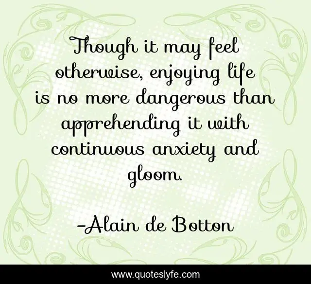 This page presents the quote "Though it may feel otherwise, enjoying life is no more dangerous than apprehending it with continuous anxiety and gloom.". Author of this quote is Alain de Botton. This quote is about enjoyment, gloom, life, anxiety,.