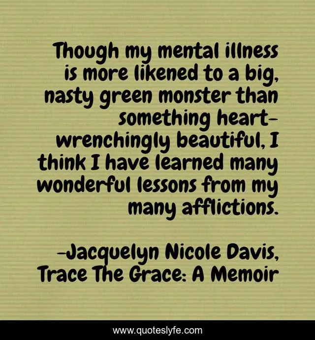 This page presents the quote "Though my mental illness is more likened to a big, nasty green monster than something heart-wrenchingly beautiful, I think I have learned many wonderful lessons from my many afflictions.". Author of this quote is Jacquelyn Nicole Davis, Trace The Grace: A Memoir. This quote is about monsters-within, painful-memories, life-lessons, mental-illness,.