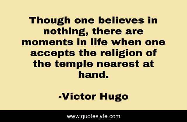 This page presents the quote "Though one believes in nothing, there are moments in life when one accepts the religion of the temple nearest at hand.". Author of this quote is Victor Hugo. This quote is about athiesm, skepticism, belief, in-the-foxholes,.