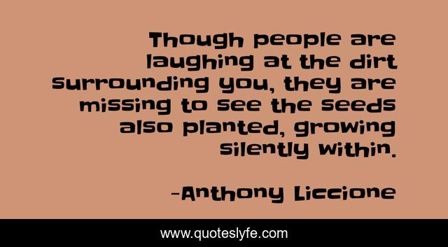 This page presents the quote "Though people are laughing at the dirt surrounding you, they are missing to see the seeds also planted, growing silently within.". Author of this quote is Anthony Liccione. This quote is about faith, perception, silent, people, belittling, making-fun-of, scoffing, hidden-within, judgmental,.