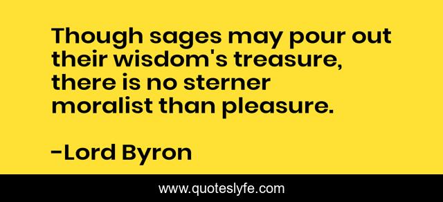 This page presents the quote "Though sages may pour out their wisdom's treasure, there is no sterner moralist than pleasure.". Author of this quote is Lord Byron. This quote is about may, pleasure, treasure,.