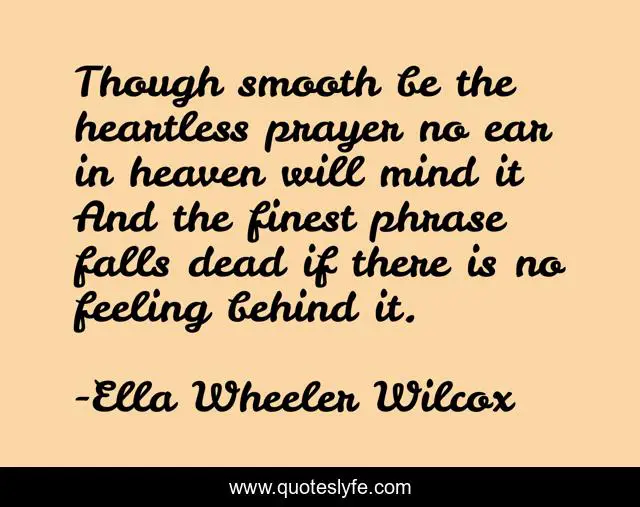 This page presents the quote "Though smooth be the heartless prayer no ear in heaven will mind it And the finest phrase falls dead if there is no feeling behind it.". Author of this quote is Ella Wheeler Wilcox. .
