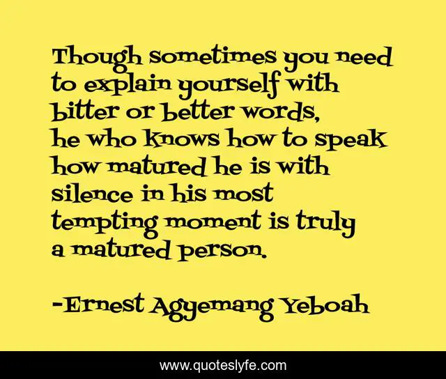 This page presents the quote "Though sometimes you need to explain yourself with bitter or better words, he who knows how to speak how matured he is with silence in his most tempting moment is truly a matured person.". Author of this quote is Ernest Agyemang Yeboah. This quote is about emotions, maturity, emotional-intelligence, emotions-and-attitude, temper, temptations,.