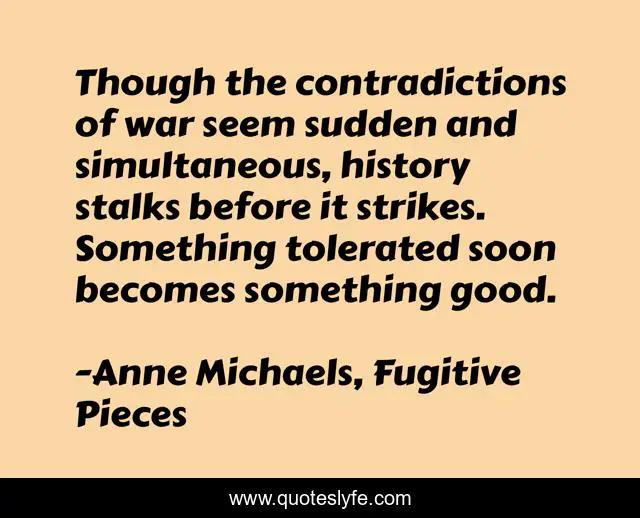 "Anne Michaels, Fugitive Pieces Quotes." Quoteslyfe.com, 2025. Sat. 06 Dec. 2025. <https://www.quoteslyfe.com/quote/Though-the-contradictions-of-war-seem-sudden-52327>.