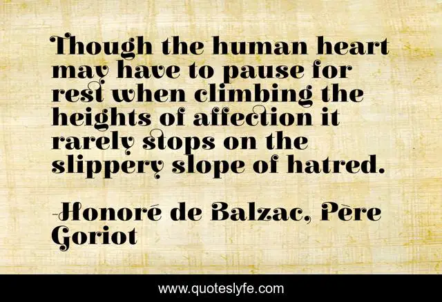 This page presents the quote "Though the human heart may have to pause for rest when climbing the heights of affection it rarely stops on the slippery slope of hatred.". Author of this quote is Honoré de Balzac, Père Goriot. This quote is about heart, hatred, love, affection, emotions,.
