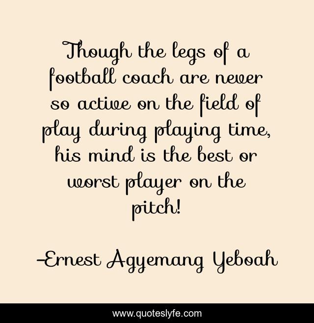 This page presents the quote "Though the legs of a football coach are never so active on the field of play during playing time, his mind is the best or worst player on the pitch!". Author of this quote is Ernest Agyemang Yeboah. This quote is about teaching, coaching, soccer, directing-life, football,.