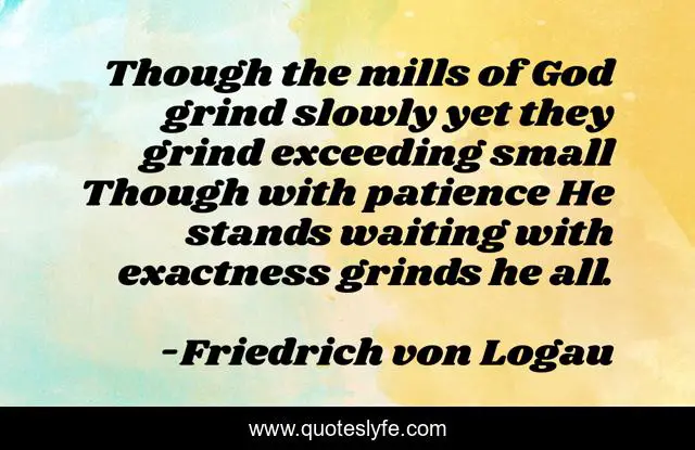 This page presents the quote "Though the mills of God grind slowly yet they grind exceeding small Though with patience He stands waiting with exactness grinds he all.". Author of this quote is Friedrich von Logau. .