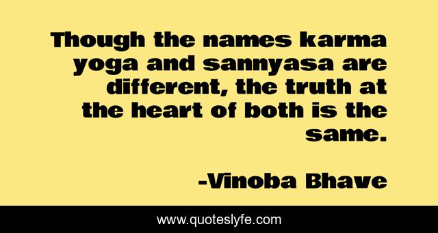 This page presents the quote "Though the names karma yoga and sannyasa are different, the truth at the heart of both is the same.". Author of this quote is Vinoba Bhave. This quote is about heart, karma, names,.