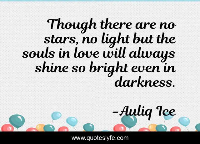 This page presents the quote "Though there are no stars, no light but the souls in love will always shine so bright even in darkness.". Author of this quote is Auliq Ice. This quote is about love, joy, joyful-living, joy-of-life, happiness, happy-endings, affection,.