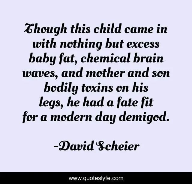 This page presents the quote "Though this child came in with nothing but excess baby fat, chemical brain waves, and mother and son bodily toxins on his legs, he had a fate fit for a modern day demigod.". Author of this quote is David Scheier. This quote is about wordsmith, illustrator, writing-from-the-heart, author, writer, david-scheier, wordplay, short-stories, reader,.