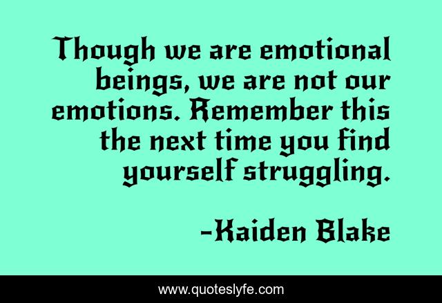 This page presents the quote "Though we are emotional beings, we are not our emotions. Remember this the next time you find yourself struggling.". Author of this quote is Kaiden Blake. This quote is about inspiring, inspirational, mindfulness, kaiden-blake, spiritual, emotions, feelings, spirituality, sadness,.