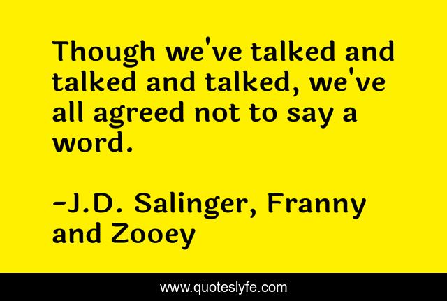 This page presents the quote "Though we've talked and talked and talked, we've all agreed not to say a word.". Author of this quote is J.D. Salinger, Franny and Zooey. This quote is about conversation, talking,.