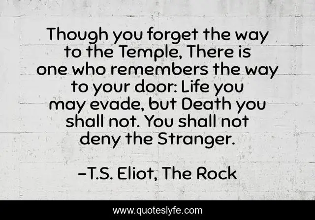 This page presents the quote "Though you forget the way to the Temple, There is one who remembers the way to your door: Life you may evade, but Death you shall not. You shall not deny the Stranger.". Author of this quote is T.S. Eliot, The Rock. This quote is about life, death, door, forgetfulness, denial, memory, temple,.