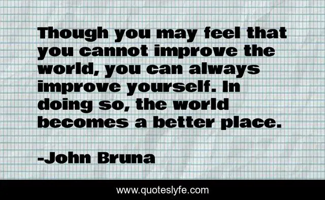 This page presents the quote "Though you may feel that you cannot improve the world, you can always improve yourself. In doing so, the world becomes a better place.". Author of this quote is John Bruna. This quote is about enthusiasm, hopeful, hope, inspirational, improvement,.