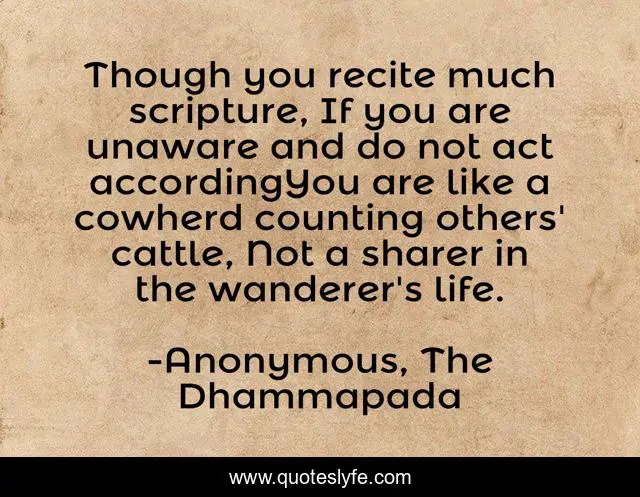 This page presents the quote "Though you recite much scripture, If you are unaware and do not act accordingYou are like a cowherd counting others' cattle, Not a sharer in the wanderer's life.". Author of this quote is Anonymous, The Dhammapada. This quote is about v-19, buddhist, scripture, awareness,.