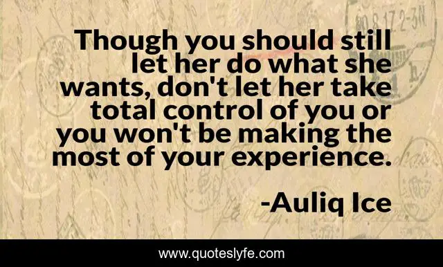 This page presents the quote "Though you should still let her do what she wants, don't let her take total control of you or you won't be making the most of your experience.". Author of this quote is Auliq Ice. This quote is about love-at-first-sight, marriage-advice, marriage,.