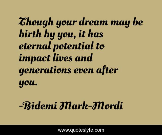 This page presents the quote "Though your dream may be birth by you, it has eternal potential to impact lives and generations even after you.". Author of this quote is Bidemi Mark-Mordi. This quote is about impact, potential, dream, purpose,.