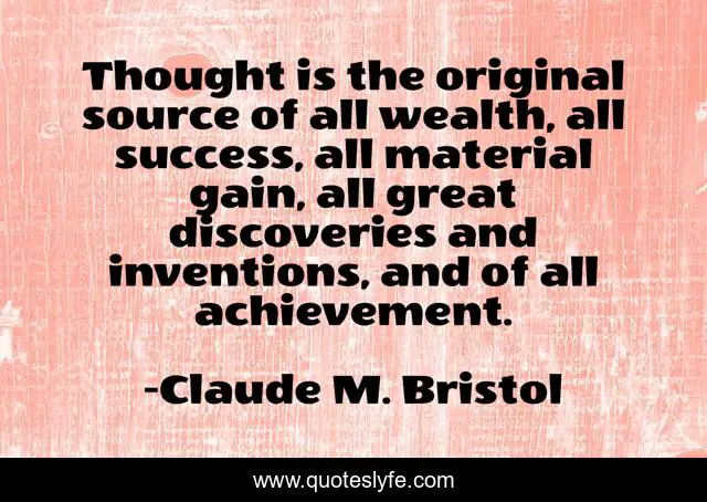 This page presents the quote "Thought is the original source of all wealth, all success, all material gain, all great discoveries and inventions, and of all achievement.". Author of this quote is Claude M. Bristol. This quote is about great, wealth, achievement,.