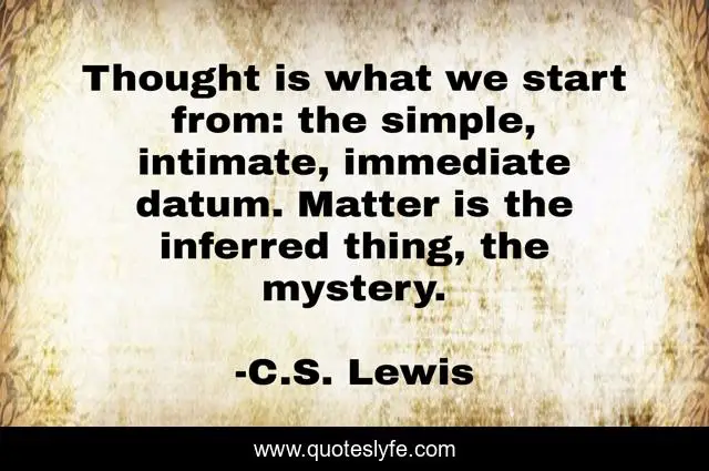 This page presents the quote "Thought is what we start from: the simple, intimate, immediate datum. Matter is the inferred thing, the mystery.". Author of this quote is C.S. Lewis. This quote is about philosophy, c-s-lewis,.