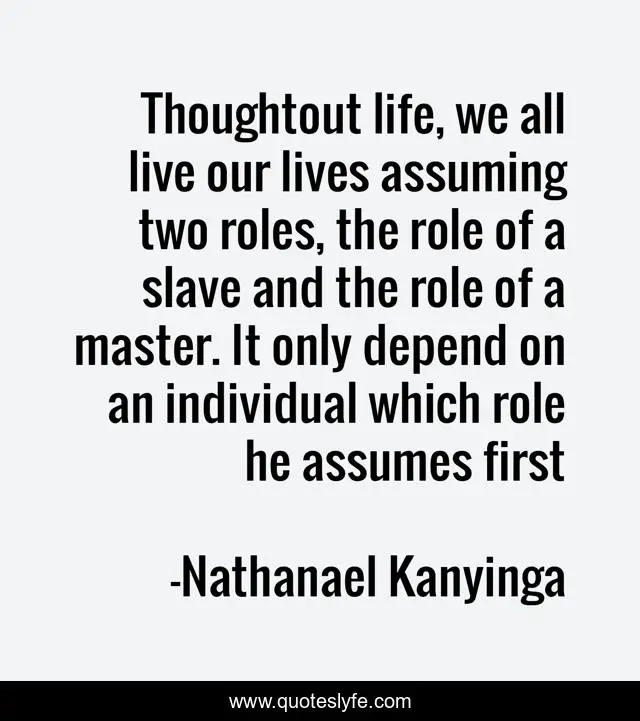 This page presents the quote "Thoughtout life, we all live our lives assuming two roles, the role of a slave and the role of a master. It only depend on an individual which role he assumes first". Author of this quote is Nathanael Kanyinga. This quote is about poor, slave-and-master, rich,.