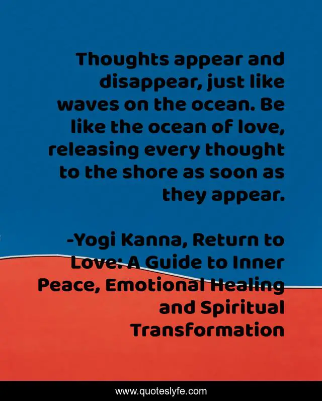 This page presents the quote "Thoughts appear and disappear, just like waves on the ocean. Be like the ocean of love, releasing every thought to the shore as soon as they appear.". Author of this quote is Yogi Kanna, Return to Love: A Guide to Inner Peace, Emotional Healing and Spiritual Transformation. This quote is about thoughts, meditation, love, spiritual, affection,.
